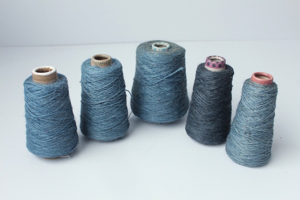 Tässä paketissa kaikki kerät ovat ohutta juuttilankaa, tex 330x2. Paketin kaikki langat ovat sinisävyisiä, kerien välillä on sävyeroja.